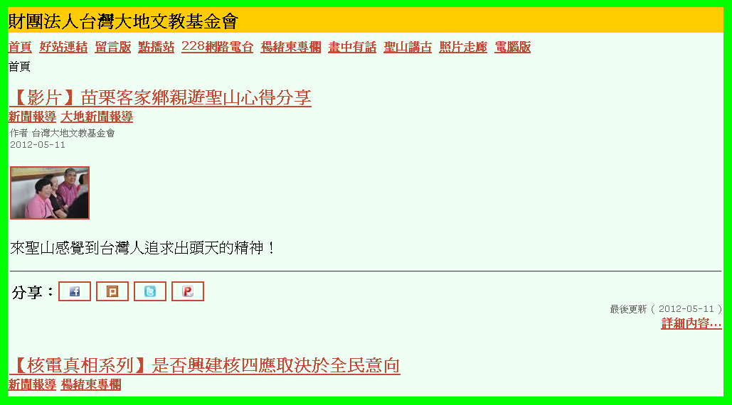 新聞報導 - 大地新聞報導 作者 台灣大地文教基金會 2012/05/03, Thursday